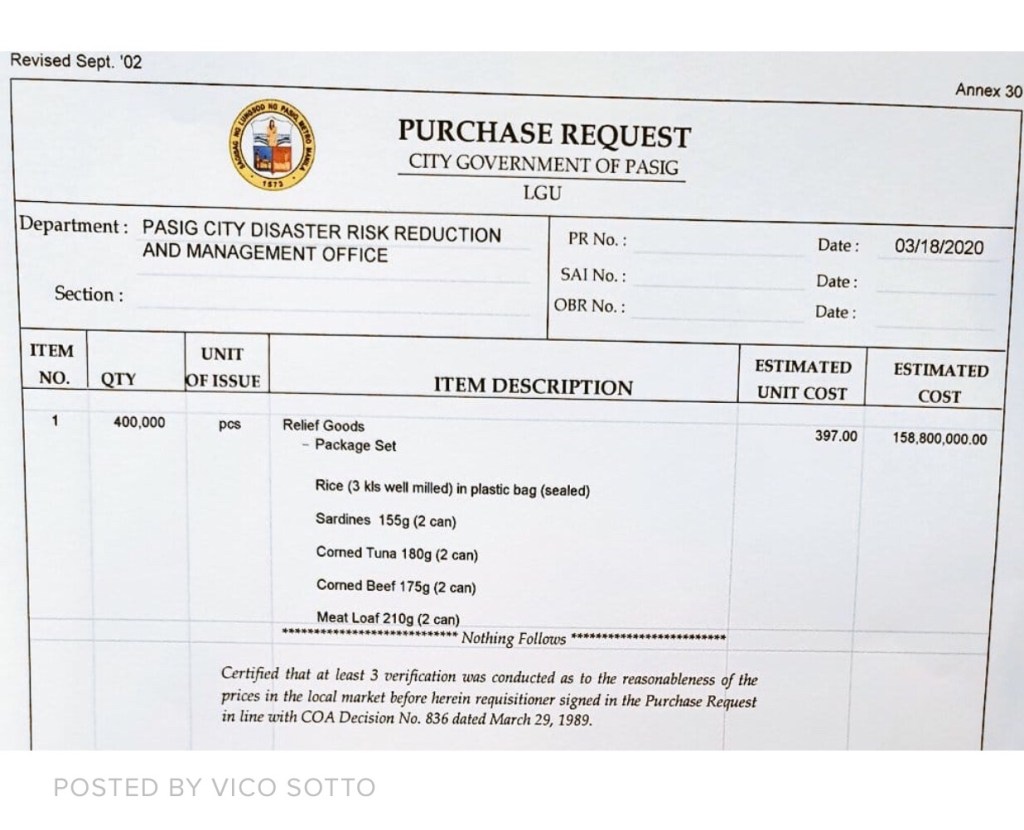 Noong Marso 18 pa lang naiproseso na ng Lungsod Pasig ang pagbili ng 400,000 na food packs na naglalaman ng 3 kilong bigas, 2 latang sardinas, 2 latang corned beef, 2 latang tuna, at 2 latang meat loaf. Gin-post pa ni Meyor Sotto sa kaniyang Instagram ang purchase requisition slip nito. Tig-397 ang bawat food pack at ang kabuoang halaga nito ay PhP158.8 milyon. Transparency ang tawag dito! Kalakaran sa mga transaksiyon sa pamahalaan na may cut, tubo, or porsiyento ang mga opisyal. Mahirap pamarisan ang ginagawang ito si Vico!