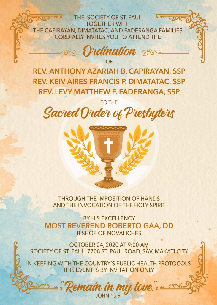 Kahapon kasi, Oktubre 24, nag-attend ako ng ordination ng estudyante kong si Brother (Siyempre Father na siya ngayon) Anthony Capirayan ng Society of St. Paul sa Sanctuary of St. Paul the Apostle sa San Antonio Village sa Lungsod Makati. Kasama ni Anthony na inordinahan sina Rev. Keiv Aires Francis Dimatatac at Rev. Levy Matthew Faderanga. Ang seremonya ay pinamunuan ni Most Rev. Roberto Gaa, DD, na obispo ng Diocese of Novaliches. Master of Fine Arts in Creative Writing student namin si Anthony, na isang taga-Iloilo, sa La Salle Taft ngayon at nagsusulat na siya ng kaniyang thesis na koleksiyon ng mga maikling kuwento sa Hiligaynon na may self-translation into English. Ang maikling kuwento niya na sinulat sa aming klase at natalakay sa San Agustin Writers Workshop ay nanalo ng Palanca noong nakaraang taon.