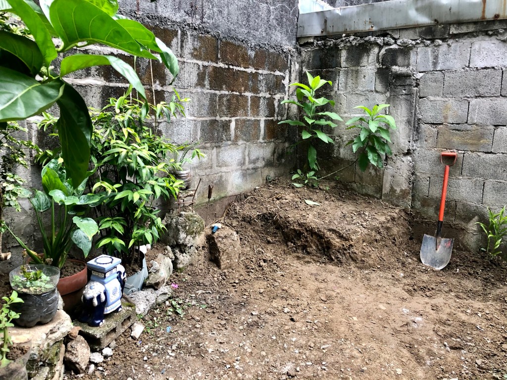 Inilipat ko sa kabilang dulo ng pader ang mga lupa. Manual labor to the max! Basang-basa ng pawis ang t-shirt ko kapag nagbubungkal at humahakot ako ng lupa. Unang casualty ang mga kamote. Pagkatapos ang Chinese taro. Pero hindi ako masyadong naghihinayang para dito dahil may anim na puno na akong nailipat noon pa man sa mga flower pot. May ilang kaibigan na rin akong nabigyan nito.