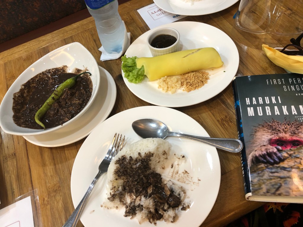 Dinuguan na may kanin siyempre ang inorder ko. Para may veggies, nag-order din ako ng isang lumpia ubod fresh. Mineral water na ang drinks ko para healthy. Habang kumakain, nagbabasa ako ng libro ni Murakami.