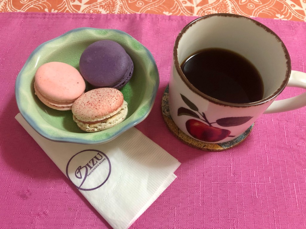 Nang malapit na ako sa Bizu, nagdesisyon akong bumili na lamang ng tatlong piraso ng macarons at dadalhin ko ito pauwi. Ito na ang aking kakainin sa pag-inom ko ng kape mga alas-kuwatro ng hapon. Sa ganitong paraan, mas makakatipid ako, mas safe pa sa COVID, at makakauwi na ako agad at makapag-umpisa na sa pagbabasa ng mga bagong biling libro. Tatlong flavors ng macarons ang binili ko: rose, blueberry, at raspberry! Very European at very Swedish. Hapi ako.