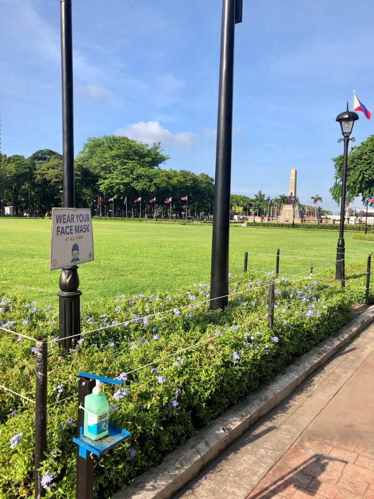 May mga dispenser ng rubbing alcohol sa maraming bahagi ng parke. May mga guwardya ring nag-iikot na may yantok, kagaya ng mga yantok ng mga pulis na panukat daw para sa physical distancing, pero dahil kakaunti lang ang mga tao hindi naman nila nagagamit ito.