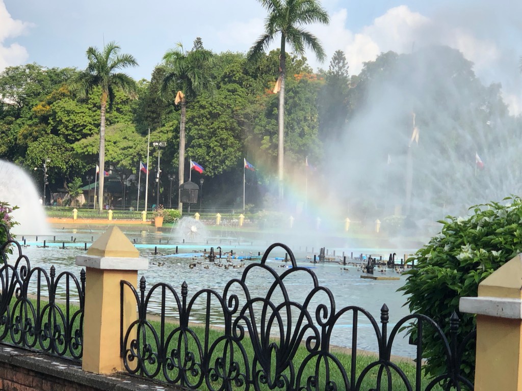 Luntiang-luntian ang parke. Ang lalakí at malalabay ang mga punongkahoy sa gilid na bumabakod sa parke. Namumulaklak ang mga puti at pink na bogambilya sa paligid ng mga fountain. Sa kortina ng tubig na binubuga ng isang fountain, may nabubuong bahaghari kapag nasisinagan ito ng silahis ng araw.