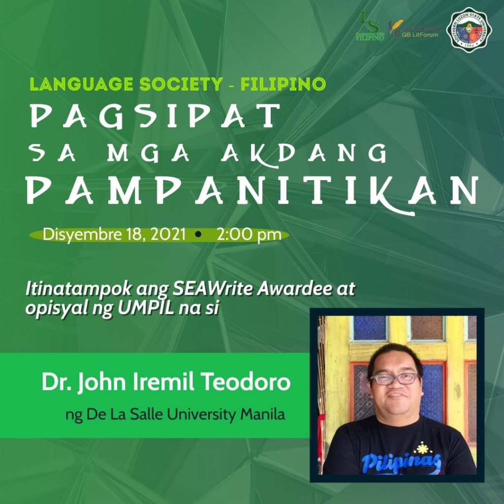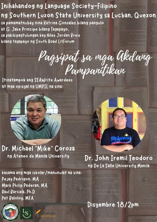 [Narito ang panayam ko sa seminar na “Pagsipat sa mga Akdang Pampanitikan” na inorganisa ng mga estudyanteng kasapi ng Language Society-Filipino ng Southern Luzon State University ng Lucban, Quezon. Salamat sa mga tagapayo nilang sina Jake Principe at Niles Jordan Breis sa pag-imbita sa akin. Pagbati rin sa mga kapuwa kong tagapagsalita: Si Dr. Mike Coroza ng Ateneo de Manila University na siyang tagapangulo ng UMPIL at ako naman ang sekretaryo heneral; sa mga graduate student ko sa De La Salle University na sina Pat Baloloy at Mark Philip Paderan; at kina Pejay Padrigon at Raul Barcela. Naging malawak, malalim, at masaya ang mga talakayan. Mabuhay ang Literaturang Filipino!]