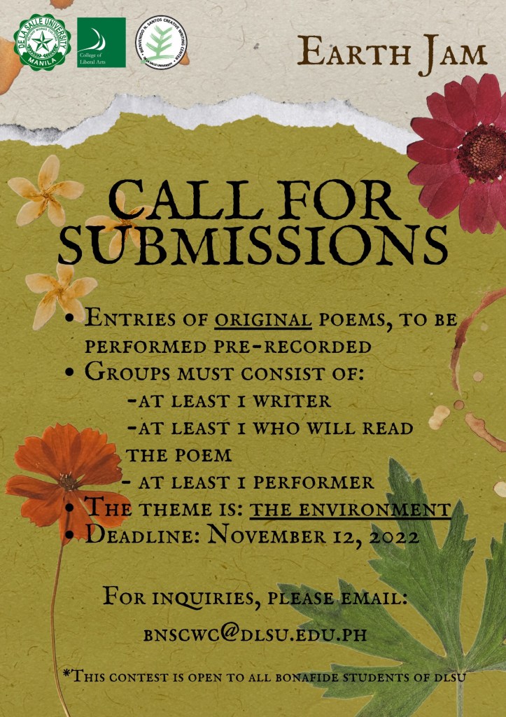 Kayâ ang Bienvenido N. Santos Creative Writing Center ay palaging nakikiisa sa College of Liberal Arts Green Initiatives. Muli inoorganisa itong Earth Jam: A Poetry Recital upang itanghal ang pagmamalasakit sa kapaligiran sa pamamagitan ng literatura. Sabi nga ni Horace hinggil sa papel ng literatura—dulce et utile. Papel ng panitikan ang magbigay aliw at aral sa manunulat at mambabasa. Ang pagsulat para sa kapaligiran ay tunay na nagdadala ng kasiyahan at kabuluhan.