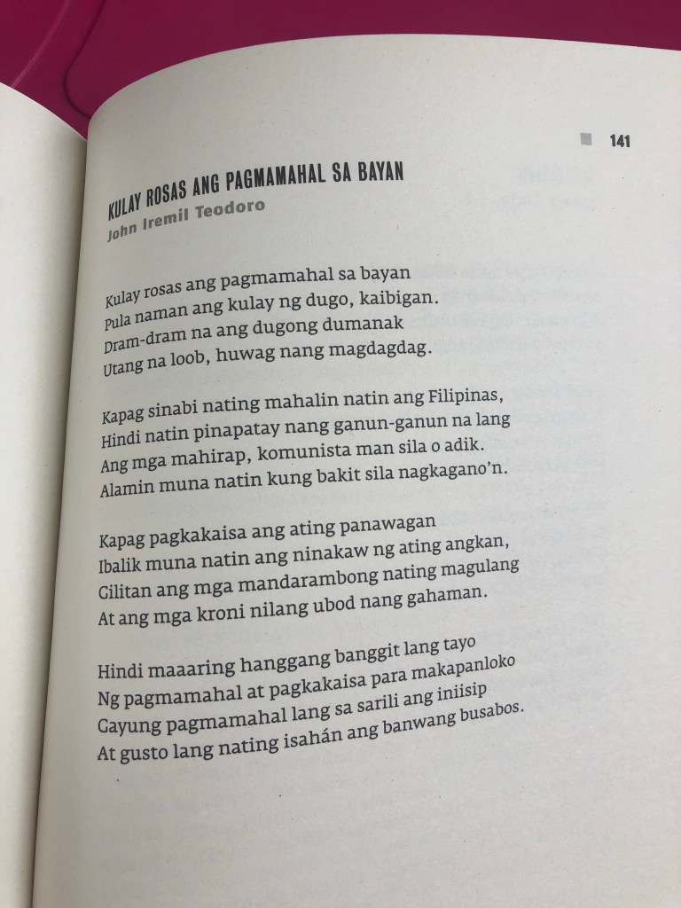 Kulay rosas ang pagmamahal sa bayan Pula naman ang kulay ng dugo, kaibigan. Dram-dram na ang dugong dumanak Utang na loob, huwag nang magdagdag.
