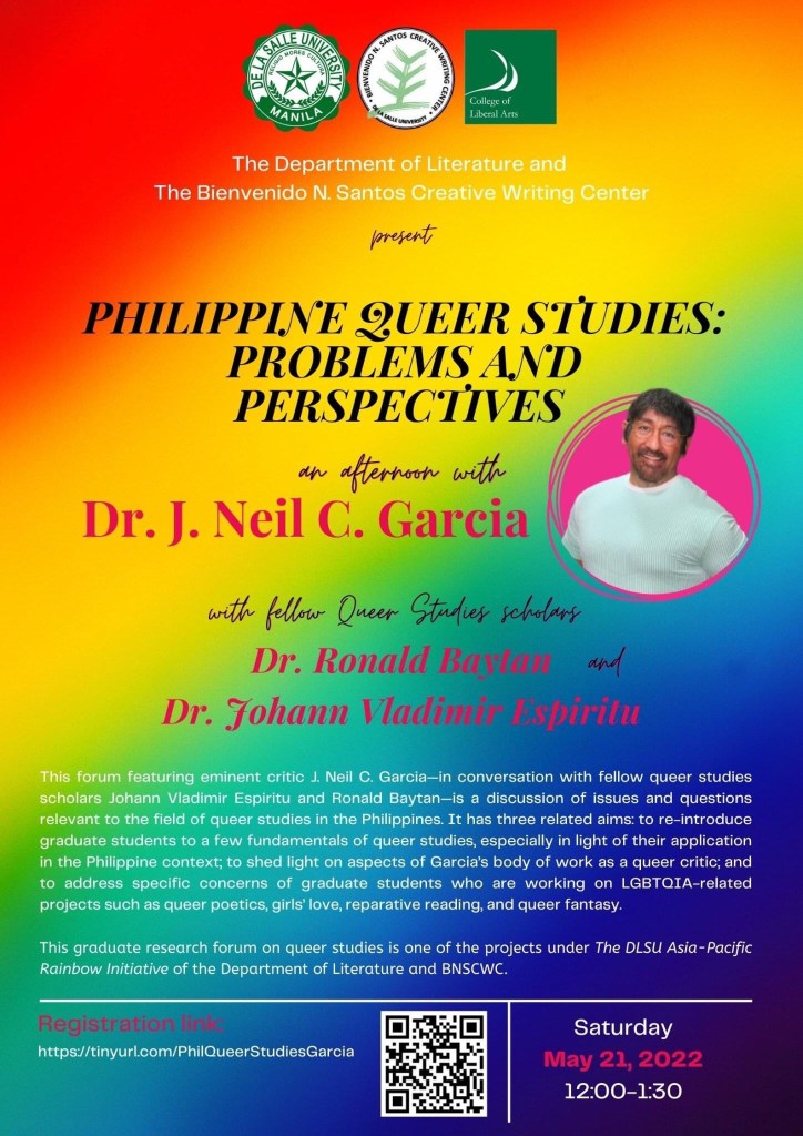 Meaning, and I would like to underscore this, for those of you graduate students of the Department of Literature who would like to write your thesis or dissertation on queerness, whether critical or creative, you are in a good place here in our sad, sad archipelago. La Salle is a friendly environment for you young queer scholars and writers.